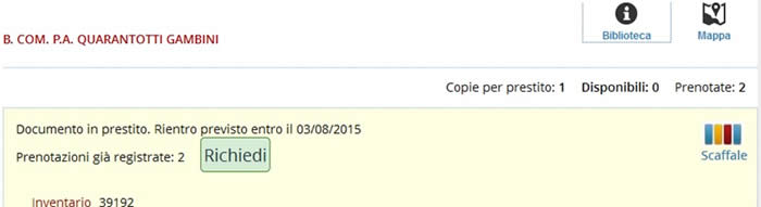Più sotto si trovano i dati relativi alla disponibilità (o all'indisponibilità) del documento: il sistema riporta la data presunta del rientro, se in prestito, e il numero di eventuali prenotazioni pendenti, se presenti.