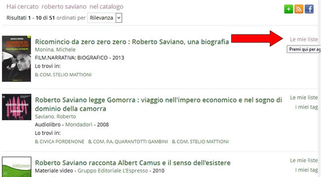 Se si desidera aggiungere un documento alla lista appena creata, quando ci si troverà in lista risultati, basterà cliccare sul + a fianco della voce