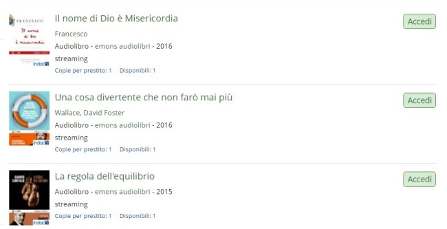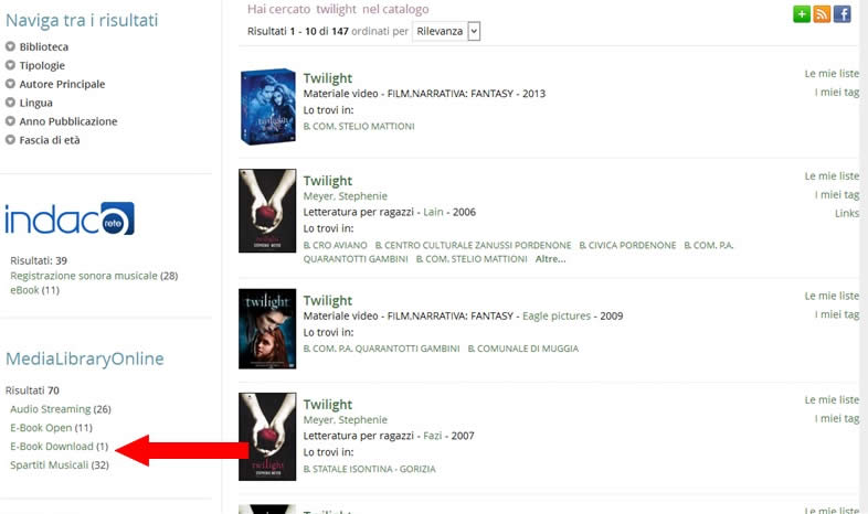 La ricerca in Biblioest permette di reperire anche documenti presenti n Medialibraryonline, che possono essere consultati grazie al widget laterale.