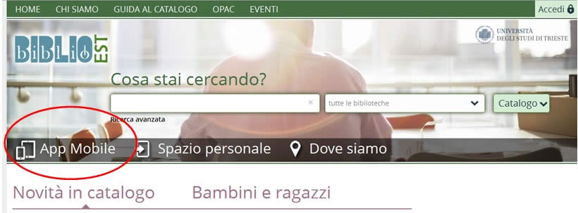 Per scaricare la App del catalogo Biblioest, cliccare sull'icona App Mobile della home page