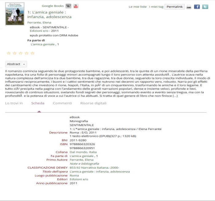 - Nella parte in alto, il titolo del documento con le indicazioni principali di responsabilità e l'anno di edizione, con la copertina del documento stesso. Subito sotto, se disponibile, l'abstract (una sorta di riassunto del contenuto) del documento stesso.