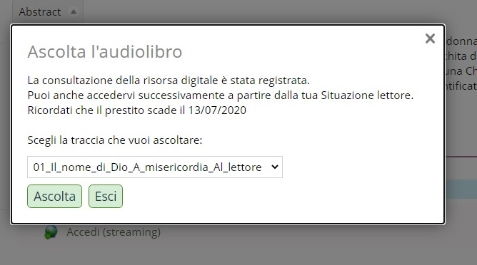 Il sistema registrerà il prestito della risorsa, che sarà fruibile immediatamente. Il link poi sarà inviato all'indirizzo di posta elettronica dell'utente e sarà presente anche nel suo spazio lettore (nel menù Prestiti – Letti e consultati)