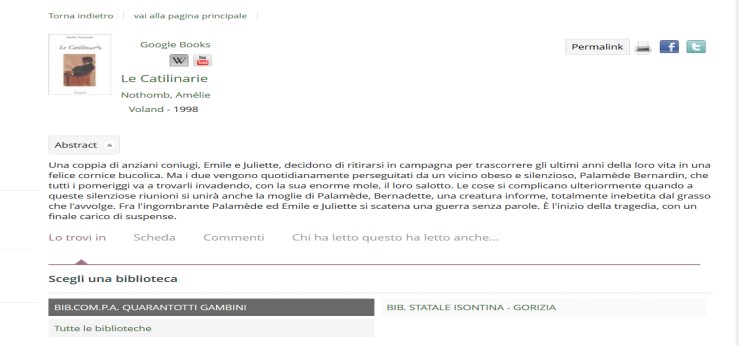 - Nella seconda parte della videata, è possibile visualizzare le biblioteche che possiedono il documento (scheda LO TROVI IN).